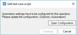 If you have not already worked with the automation tool, aqua will point out that the path to Ranorex needs to be configured. The corresponding menu is offered to you by the system. In this case click on "Open Configuration". Then select the path to the Ranorex application.