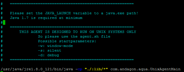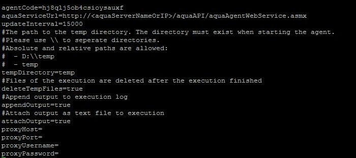 Edit the file agent.properties (e.g. using command nano) and change the line agentCode (see step 1) as well as aquaServiceUrl so that the agent can communicate with your aqua Server.