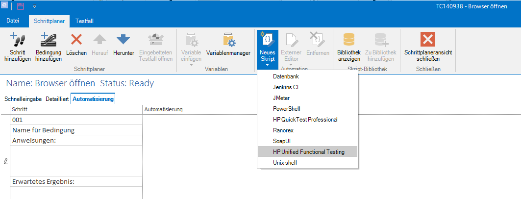 Zuerst öffnen Sie einen Testfall und klicken auf Automatisierung. Hier können Sie ein UFT Skript hinzufügen. Das Skript muss in UFT selbst erstellt werden. aqua erlaubt Ihnen den Import der UFT-Lösung, inklusive Datentabelle und Aktionen. Um die unterstützten Versionen zu sehen, schauen Sie sich die Systemanforderungen an.