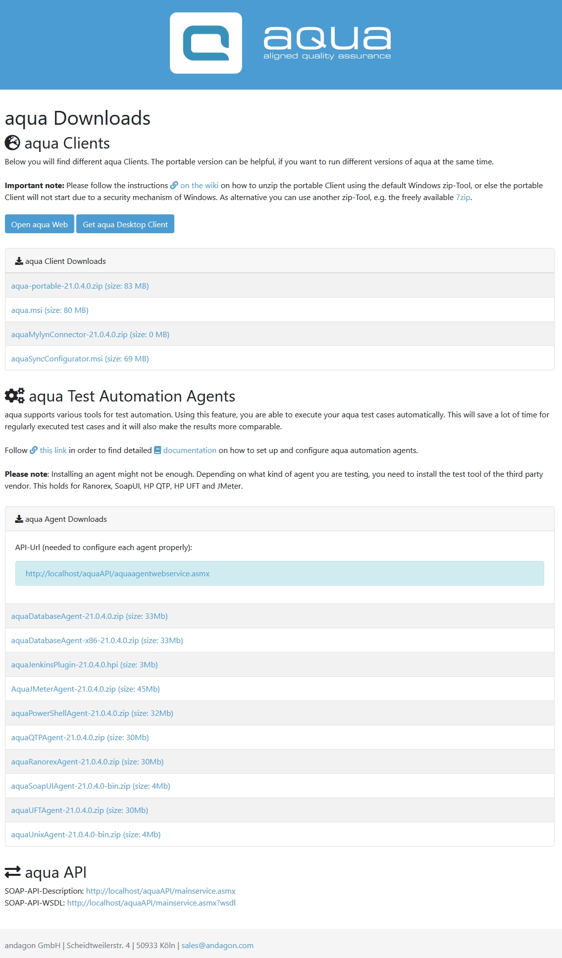 Der aqua Server beinhaltet eine Einstiegsseite, auf der Sie alle Clients, Agenten und Konnektoren finden können sowie den Link zum Webclient.
