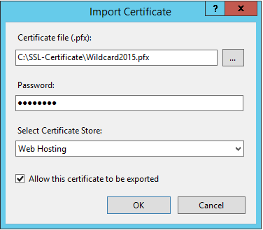 Wählen Sie das Zertifikat aus, geben Sie das Passwort ein, wählen Sie den Zertifikatsspeicher "Web Hosting" aus und (wichtig!) "Export dieses Zertifikats zulassen" (andernfalls schlägt es fehl)