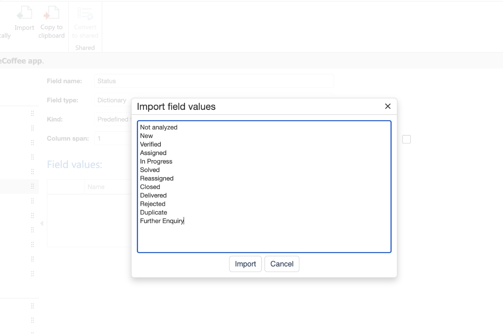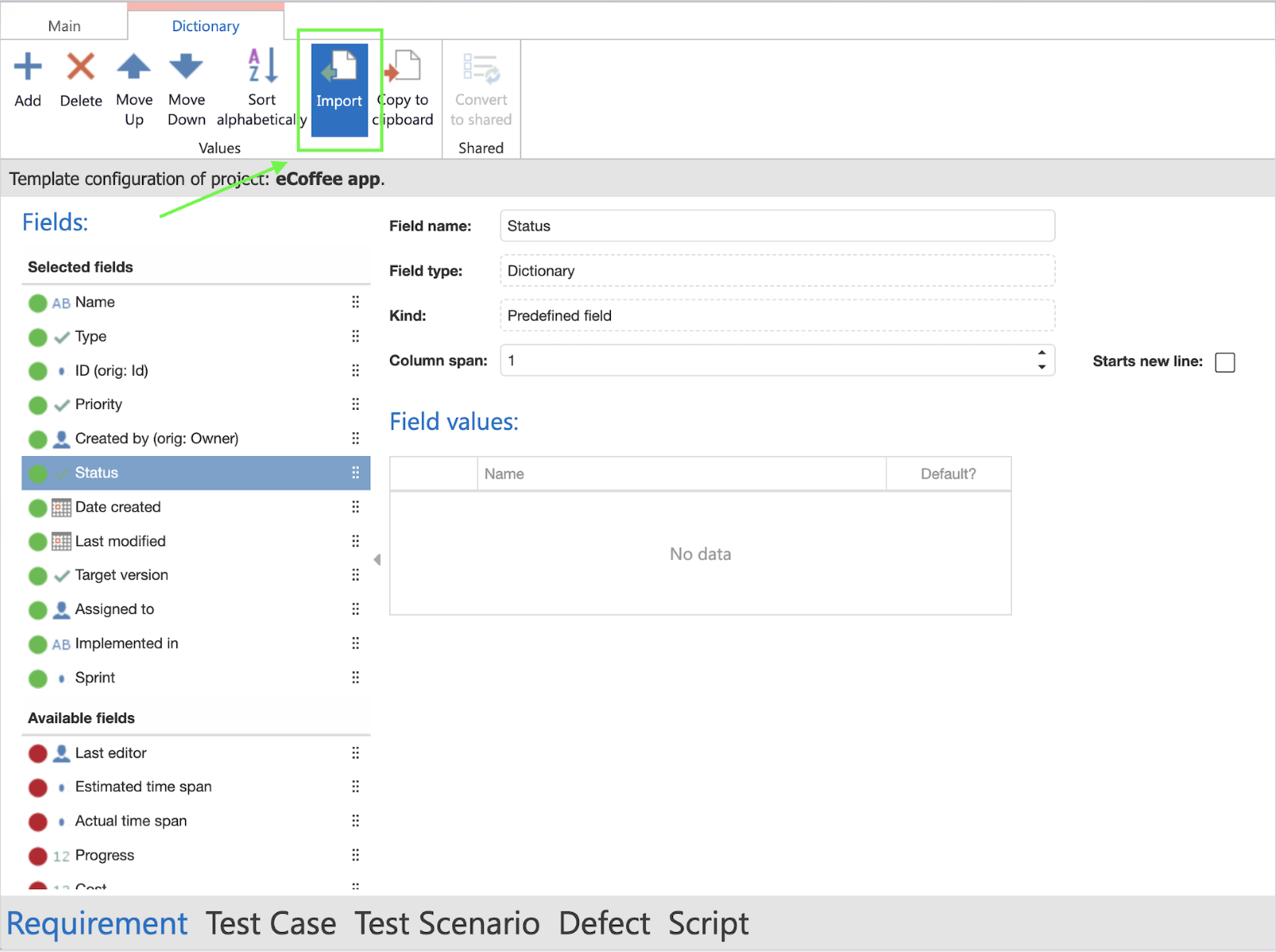 Schritt 3: Um Werte zu importieren, navigieren Sie bitte zum Vorgangstyp und wählen Sie das gewünschte Mehrfachauswahl- oder Einfachauswahlfeld aus und klicken Sie auf die Schaltfläche ‚Import‘ im Menüband. &#x20;
