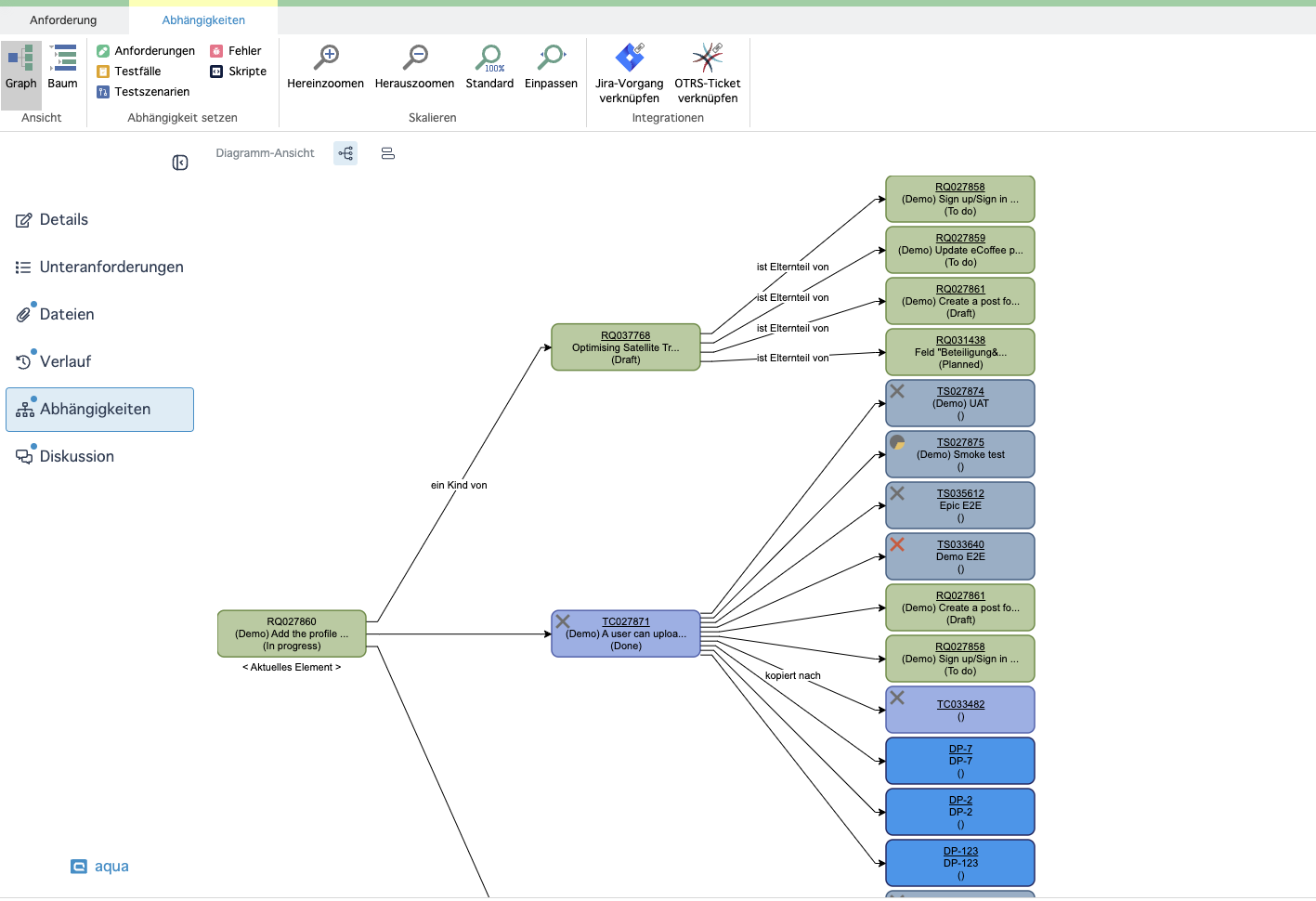 Wir haben die Abhängigkeitsvisualisierung verbessert, um Ihnen ein besseres Verständnis dafür zu ermöglichen, wie Ihre Anforderungen miteinander verbunden sind. Ab sofort können Sie von jeder Unteranforderung aus: