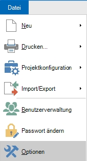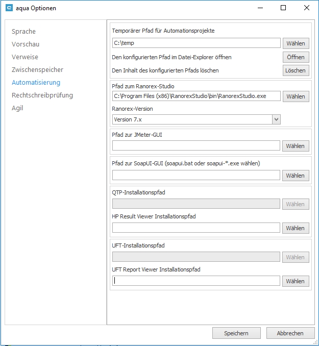 Um Tests mit verschiedenen Tools zu automatisieren, brauchen Sie eventuell ein Tool eines Drittanbieters. Der Pfad dieses Drittanbieter-Tools und eines temporären Verzeichnisses für die Automatisierung muss an aqua weitergegeben werden. Klicken Sie dafür auf Datei -> Optionen.