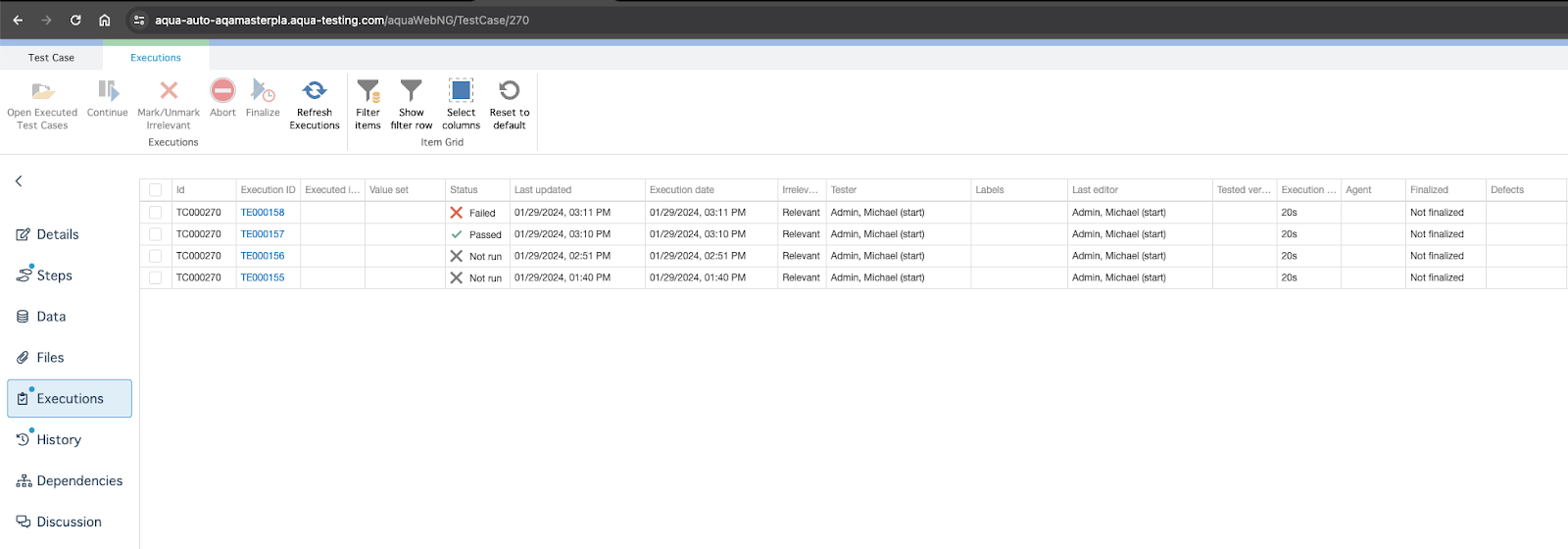 Zum Zweck der Automatisierung nehmen wir an, dass der Testtitel auf der tatsächlichen aqua-Testfall-ID basiert: z.B. im obigen Fall haben wir den aqua-Testfall mit der ID=270 aktualisiert.