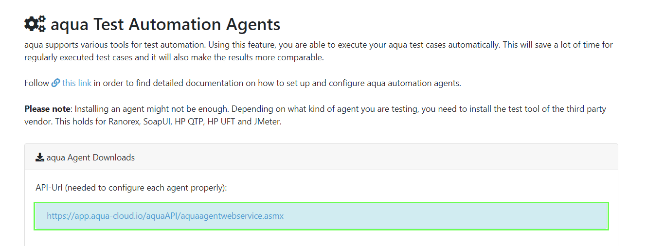 Um einen automatisierten Testfall auszuführen, muss ein Aqua-Agent konfiguriert werden. Jeder Agent verfügt über einen einzigartigen Zugangscode. Der Code wird in Aqua generiert und dem Agenten zugewiesen. Die Agenten können dann auf jedem Computer installiert werden, solange eine Verbindung zum Aqua-Server besteht. Nach der Installation und Konfiguration kommunizieren die Agenten einfach zwischen Aqua und dem jeweiligen Automatisierungstool, starten Testausführungen und geben Ergebnisse an Aqua zurück.