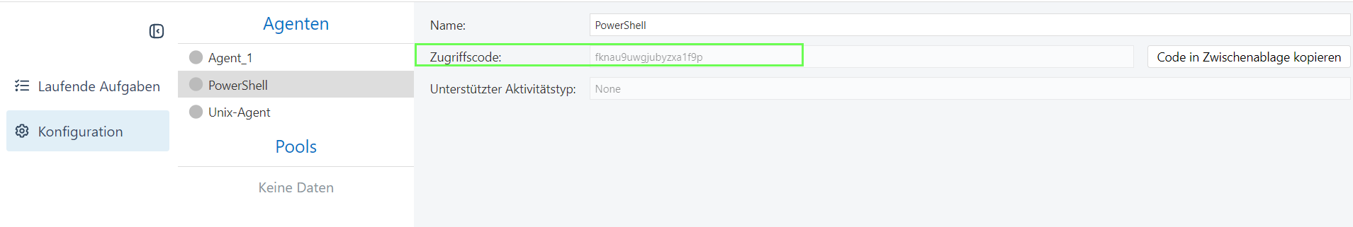 Ein Zugangsschlüssel wird automatisch generiert und ist erforderlich, um einen Agenten erfolgreich zu konfigurieren. Kopieren Sie den Passcode in die Zwischenablage oder notieren Sie ihn für die spätere Verwendung. Der Passcode dient als Kennung, um zwischen mehreren Agenten richtig zu unterscheiden.