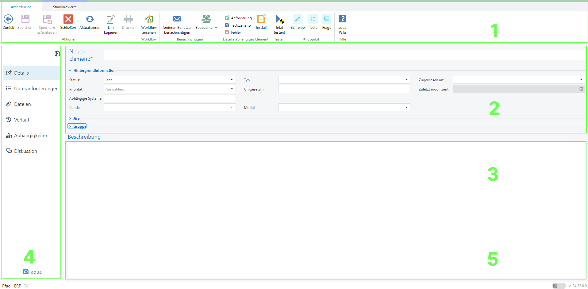 Beim Erstellen eines neuen Elements können Sie auch eine [<mark style="color:blue;">Vorlage</mark>](https://docs.aqua-cloud.io/documentation/de-documentation/~/revisions/jTwnkJ1ie293nfxptIGP/projektkonfiguration/alt-konfiguration-der-projektvorlage-felder) definieren, die bei der Erstellung weiterer Elemente desselben Typs verwendet wird.