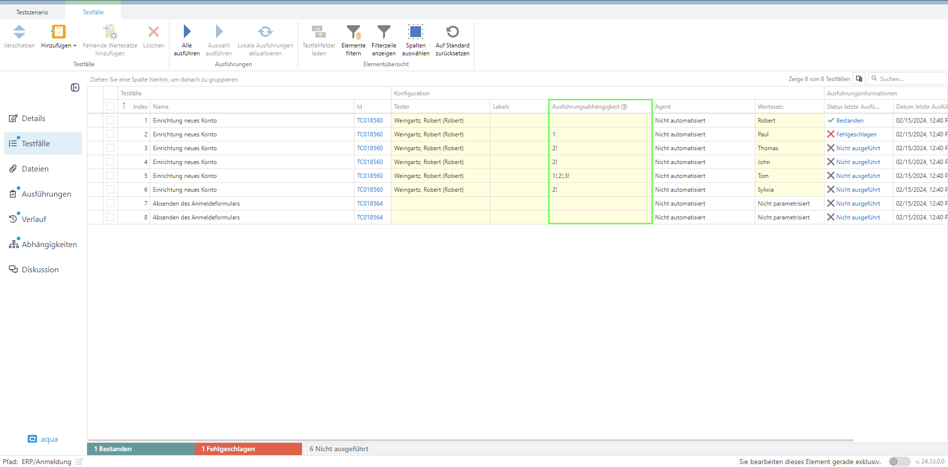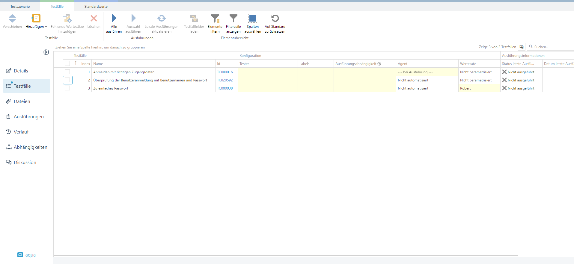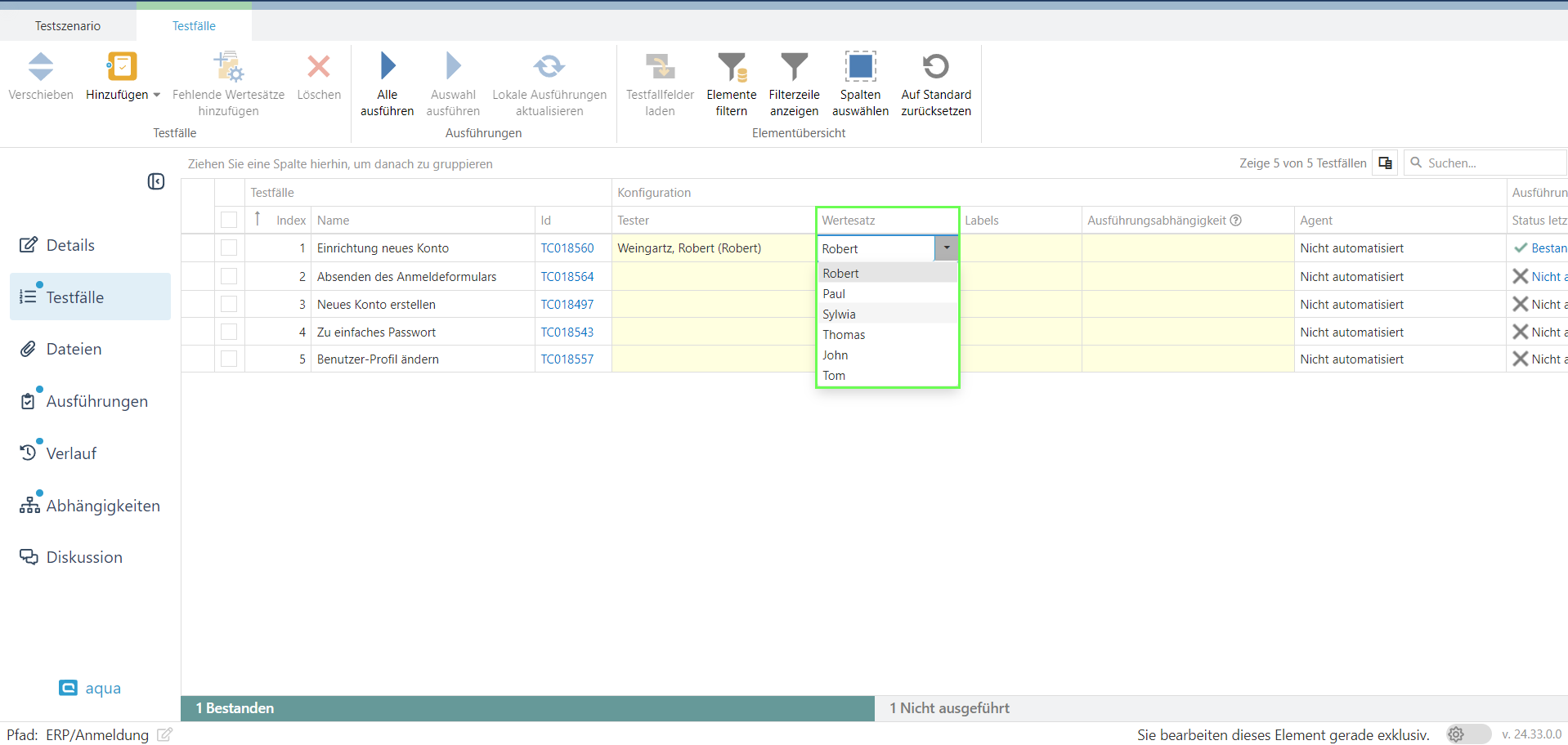Wenn ein Testfall parametrisiert ist, wird der verste Wertsatz automatisch eingetragen. Sie können auch eines der anderen Wertsätze des Testfalls in der Spalte „Wertsatz“ auswählen.