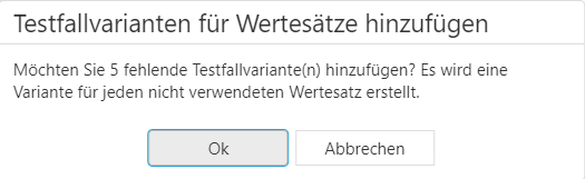 Mit der Schaltfläche 'Fehlende Wertesätze hinzufügen' können alle anderen Varianten des Testfalls als einzelne Testfälle dem Testszenario hinzugefügt werden ![](https://1531273042-files.gitbook.io/~/files/v0/b/gitbook-x-prod.appspot.com/o/spaces%2FG5QhcVbqFZtVzVvlkYfm%2Fuploads%2FgZFlo3EEys5SYsT8pN2o%2Fimage.png?alt=media\&token=78fc88c8-8735-4393-b997-6251f9145bee)