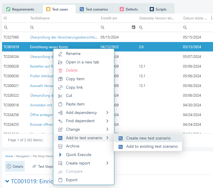 <figure><img src="https://1531273042-files.gitbook.io/~/files/v0/b/gitbook-x-prod.appspot.com/o/spaces%2FG5QhcVbqFZtVzVvlkYfm%2Fuploads%2FUHtzhU72O6QZudQbGUhk%2Fimage.png?alt=media&#x26;token=503c6a9e-6b2d-47c4-8c96-9644fb949614" alt=""><figcaption><p>Hinzufügen des Testfalls zum Testszenario über das Kontextmenü</p></figcaption></figure>
