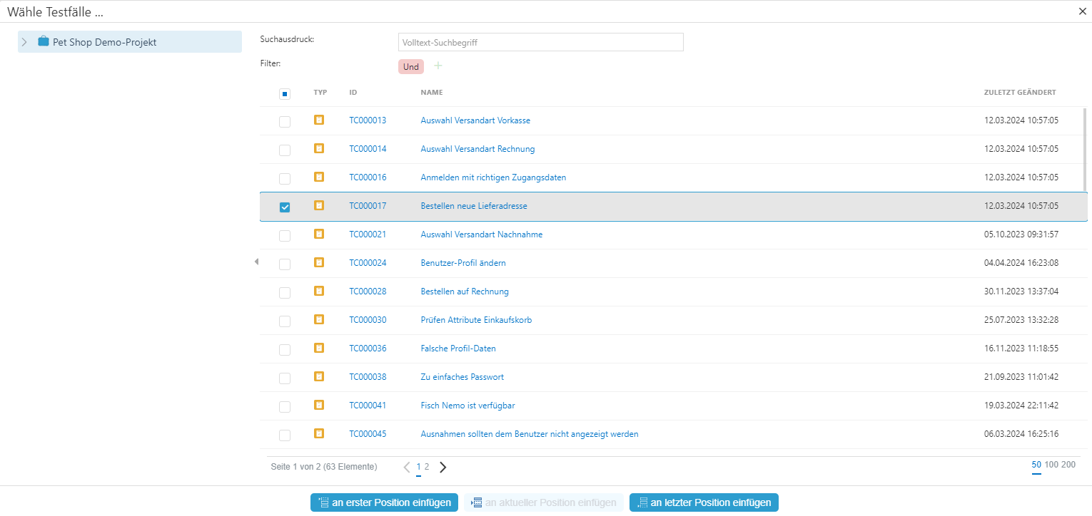 Ein Dialog öffnet sich, in dem Sie alle Testfälle im Projekt sehen. Sie können entweder nach einem bestimmten Testfall suchen oder einen Ihrer vordefinierten Filter verwenden. Wenn Sie einen Testfall auswählen, können Sie entscheiden, ob Sie ihn am Anfang oder Ende des Testszenarios hinzufügen. Nachdem Sie alle gewünschten Testfälle hinzugefügt haben, können Sie Ihr Szenario speichern.