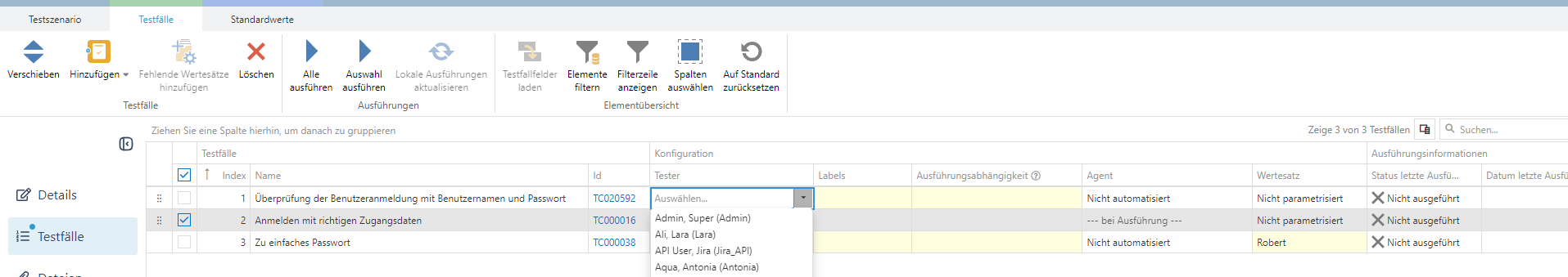 Im Szenario können Sie jedem Testfall einen Tester zuweisen. Um einen Tester einem Testfall im Szenario zuzuweisen, klicken Sie auf die leere Zelle in der Spalte 'Tester'. Ein Dropdown-Menü erscheint, aus dem Sie einen Kollegen auswählen können, der dem aktuellen Projekt zugeordnet ist. Wenn der ausgewählte Tester der aktuelle Benutzer ist, wird der Name fett angezeigt.