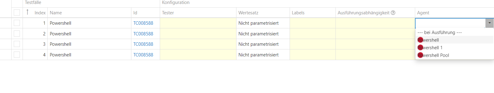 Wenn Ihre Testfälle im Testszenario automatisiert sind, können Sie einen Agenten für die Ausführung direkt im Testszenario definieren. Wenn Sie hier keinen Agenten definieren, wird der Agent automatisch während der Ausführung zugewiesen.