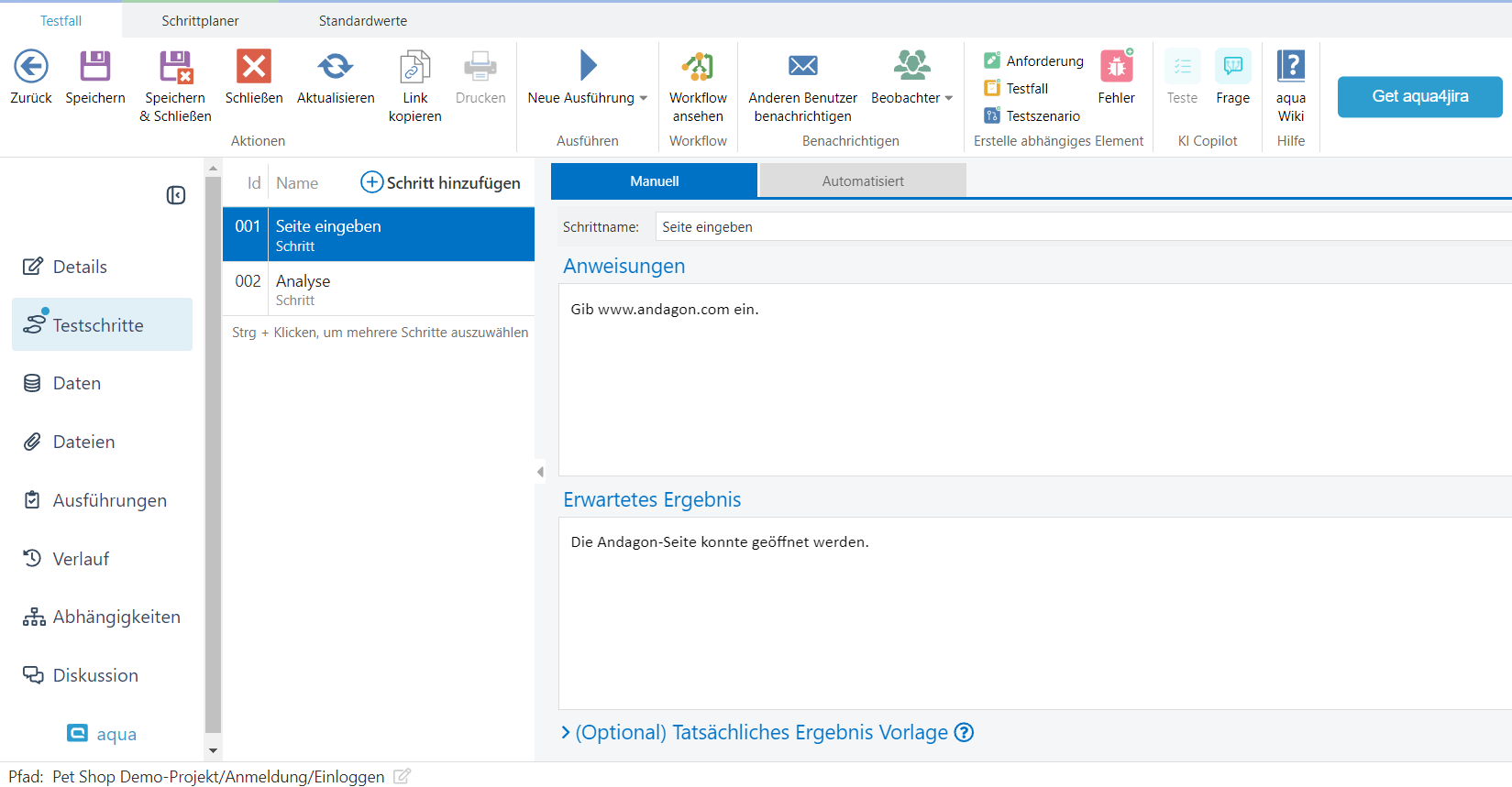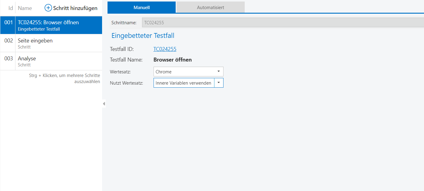 Durch das Ausführen des Testfalls werden die Parameter und Testschritte automatisch der Testausführung hinzugefügt.