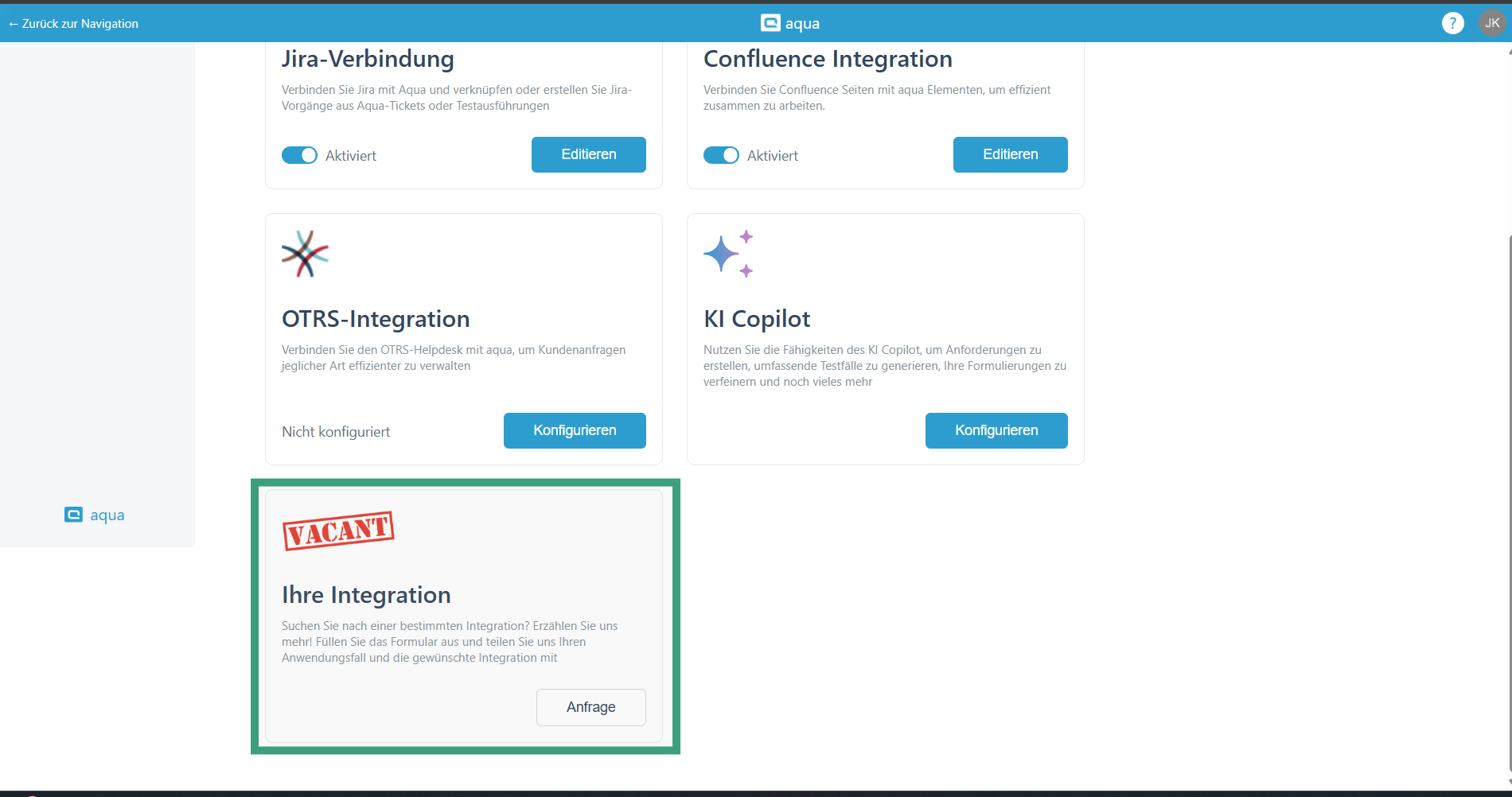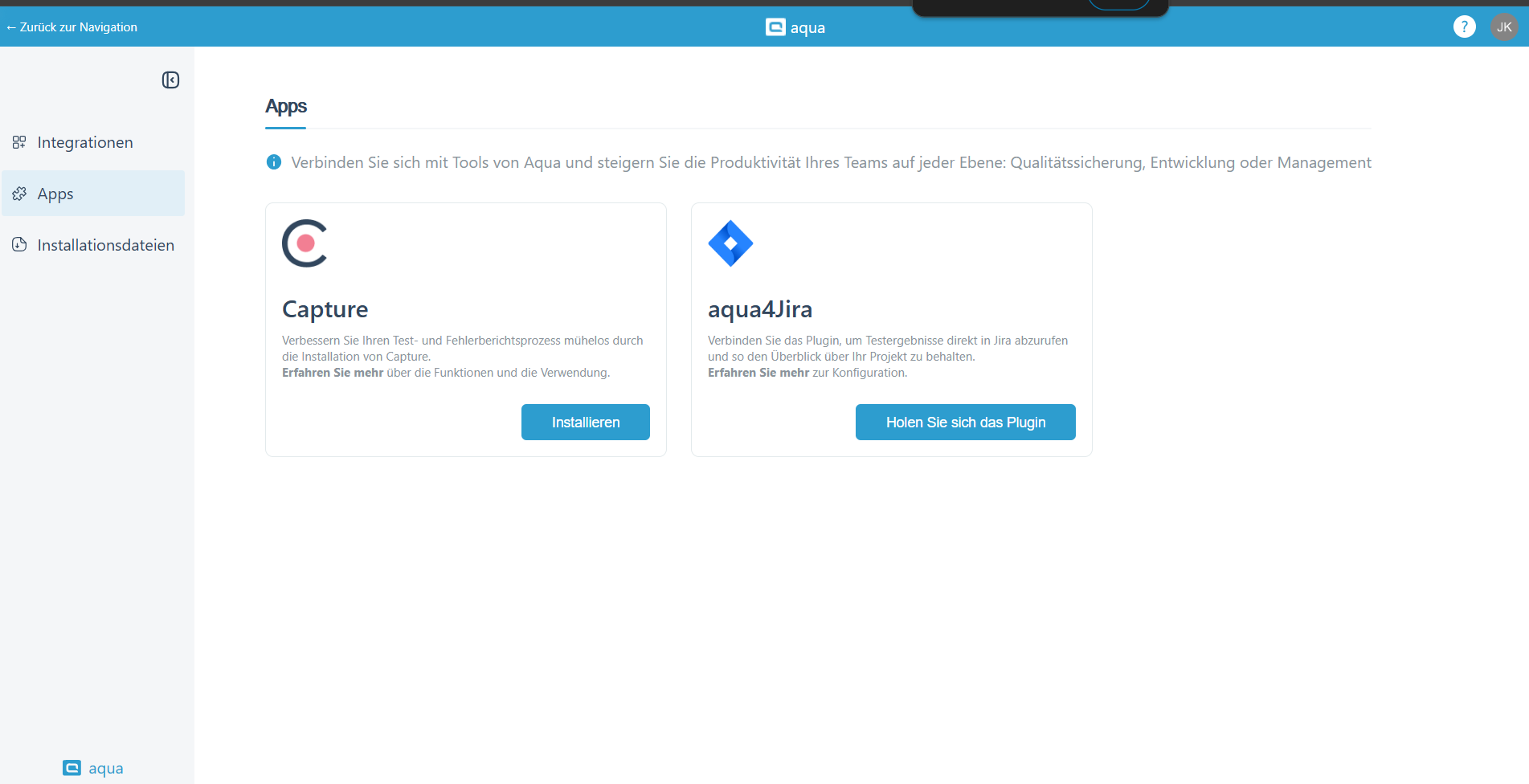 Wir haben auch die Seite mit den Aqua-Apps hinzugefügt, die Sie kostenlos herunterladen und nutzen können. Erfahren Sie [hier ](https://docs.usecapture.io/help-articles)mehr über Capture und [hier ](https://docs.aqua-cloud.io/documentation/integrations/aqua4jira-plugin-cover-jira-issue-with-aqua-test-cases)über das Jira-Plugin, falls Sie es noch nicht verwendet haben.