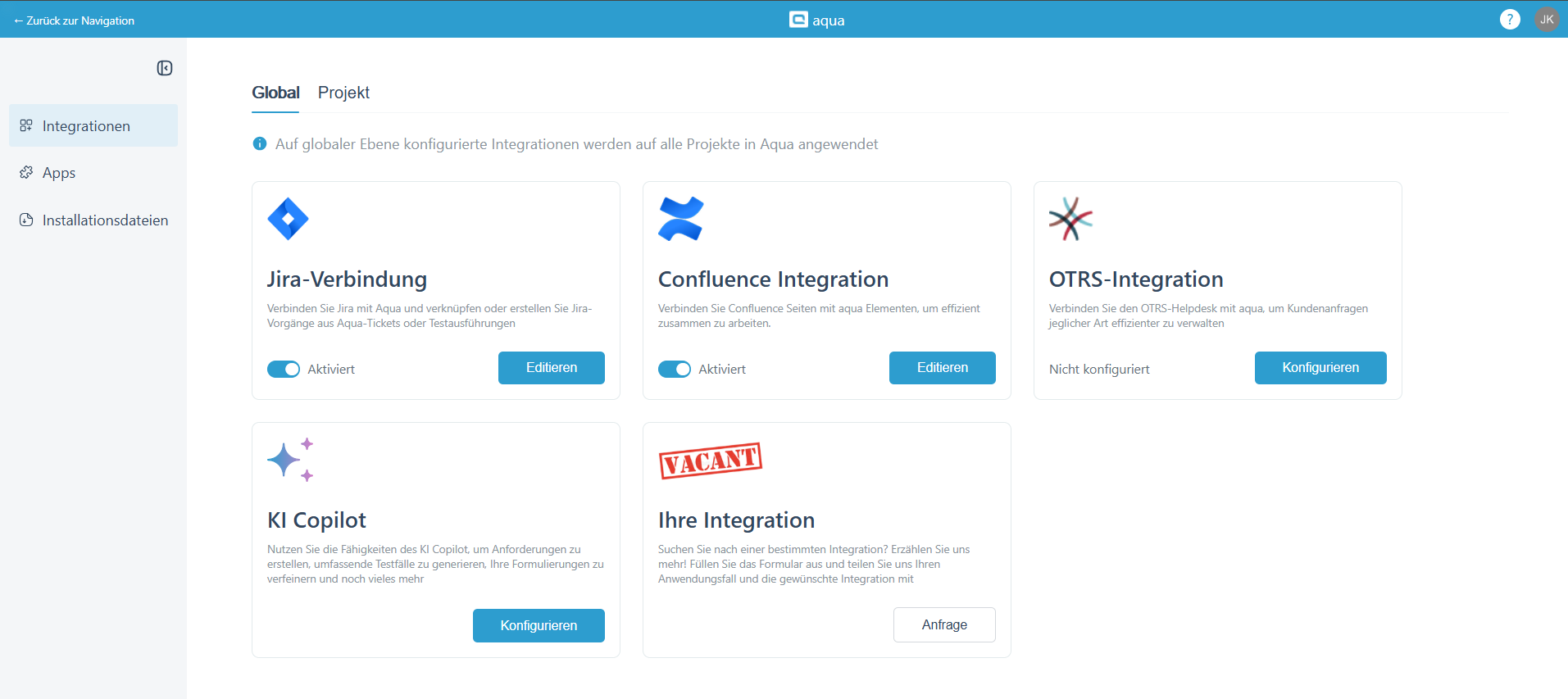 Dieser Schritt ist optional, aber empfohlen. Um Informationen über Jira-Elemente in aqua anzuzeigen, muss die Verbindung zu Jira konfiguriert werden. Um die Integration zu konfigurieren, öffnen Sie die Seite 'Integrationen', und Sie landen auf der Registerkarte 'Global'. Hier können Sie eine einzelne Integration einrichten, die für alle Projekte in aqua gilt.