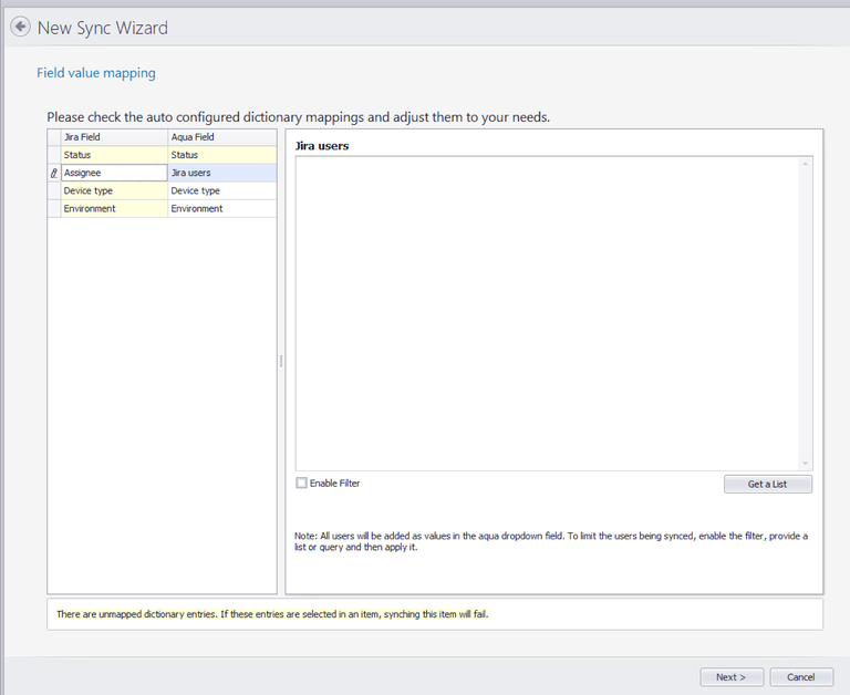 Im Jira-Synchronisationskonfigurator wählen Sie das Jira-Benutzerfeld aus und ordnen es einem zuvor erstellten Feld in aqua zu.