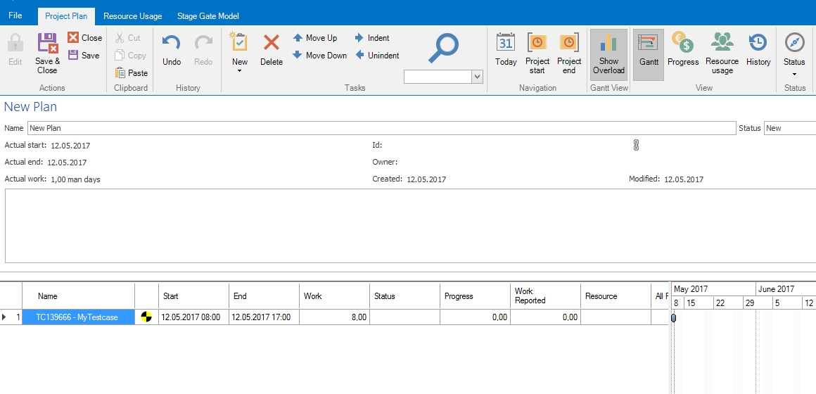Then you can add an item via drag and drop from Navigation in main window. In the following screenshot you can see that a test case has been added to the project plan.