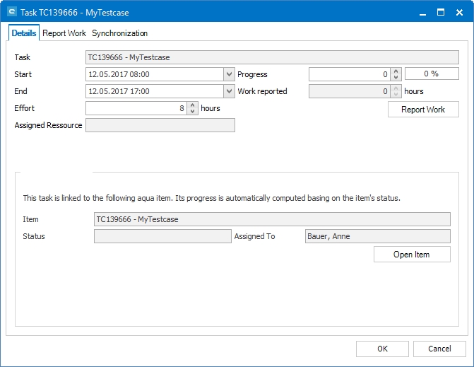 In aqua project plans are able to update automatically. This means, you can add aqua items and synchronize them. When the item is set to specific status, e.g. closed, it will be set to finished in the project plan. In order to add a aqua item to a project plan, click the