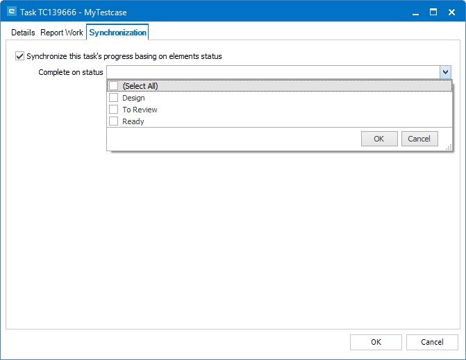 Now switch to tab 'Synchronization'. Here you can choose, which status defines completion of the item.