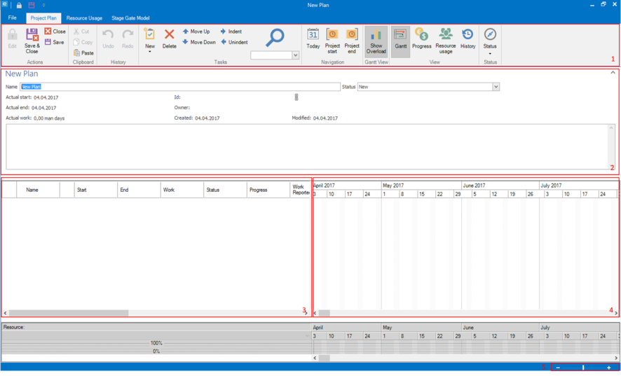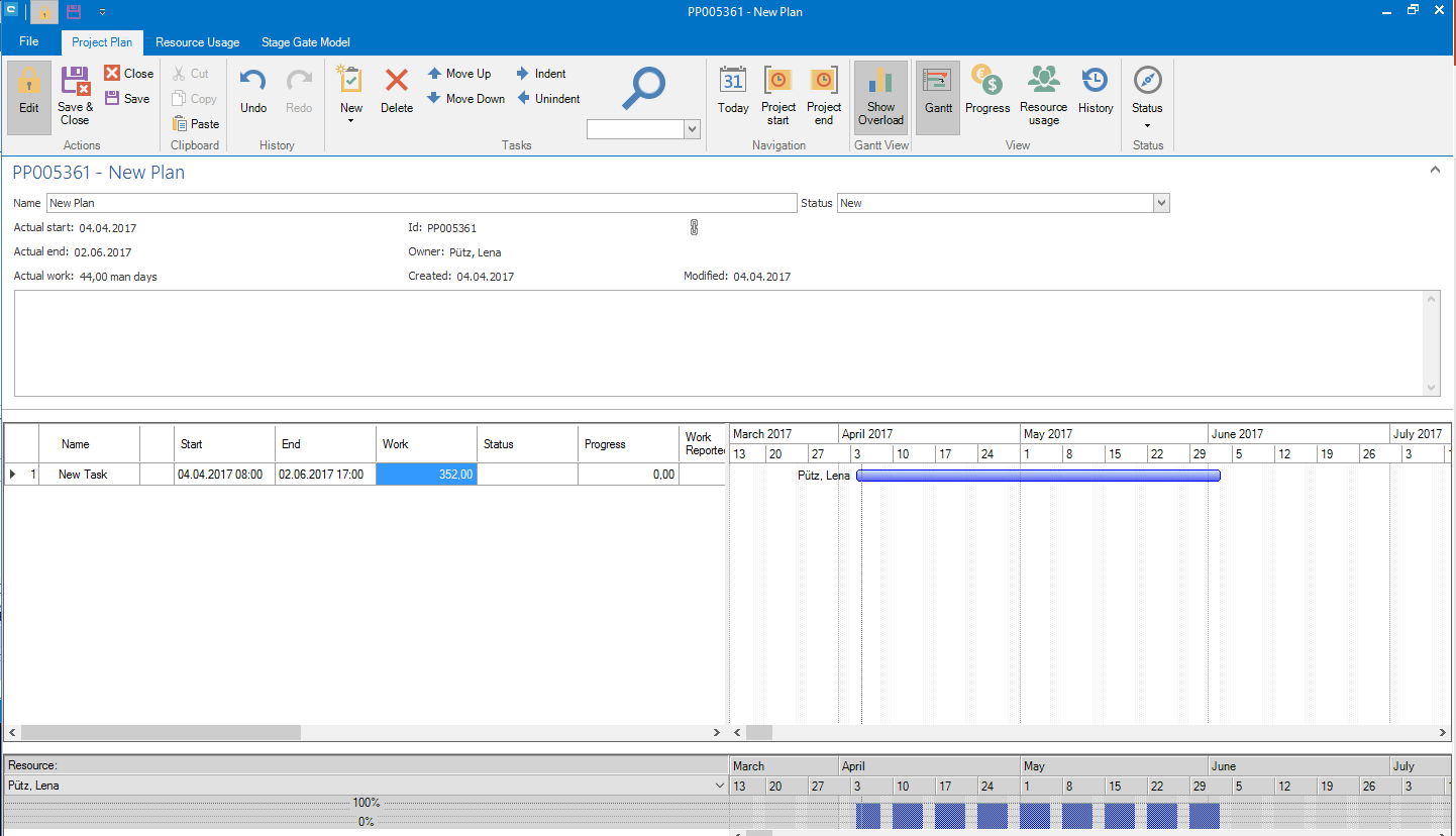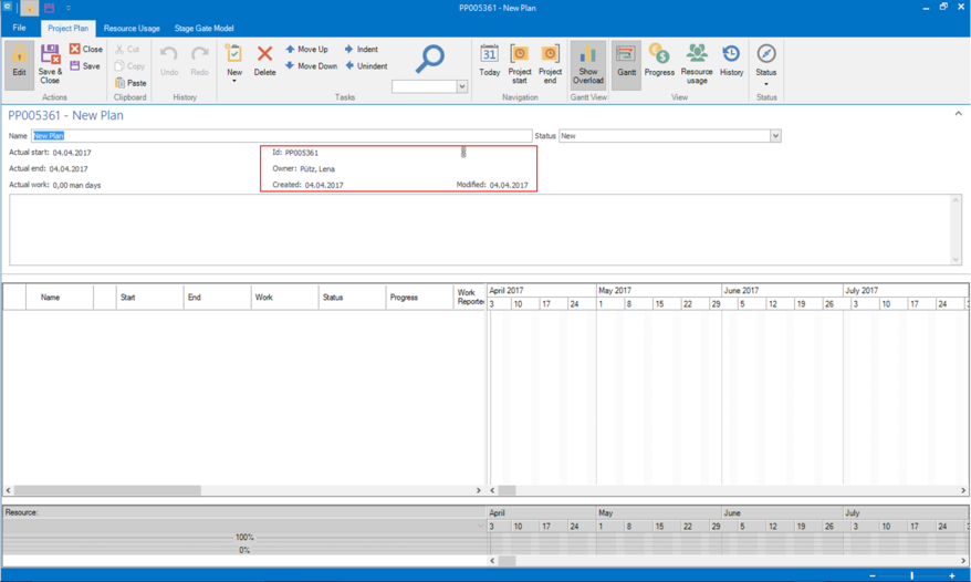 Type in a name for your project plan into field Name. Press Save in group Actions in ribbon bar. The project plan is created now and the fields ID, Owner, Created and Modified are filled with data. In order to edit the project planner, you have to press the