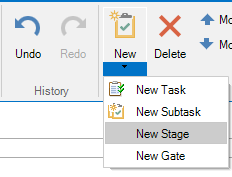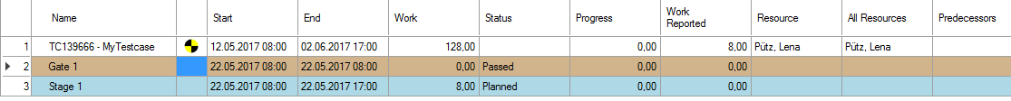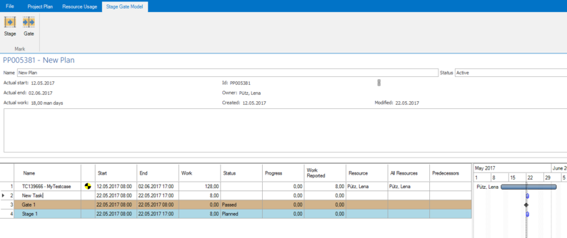 Using the Stage Gate Model tab, you can also mark existing tasks as gate or stage. The task will then be marked accordingly in table and Gantt chart.