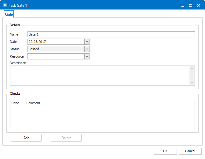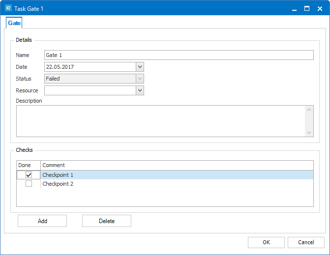 To add a checkpoint, press 'Add'. A new line will appear where you are able to give a name to the checkpoint. The checkbox allows setting it to done later on. The status of the gate will remain Failed until every checkpoint is marked as done.