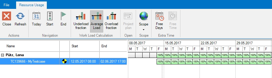 In the project plan you can see the resource usage. To do so, click on Resource Usage in the ribbon.