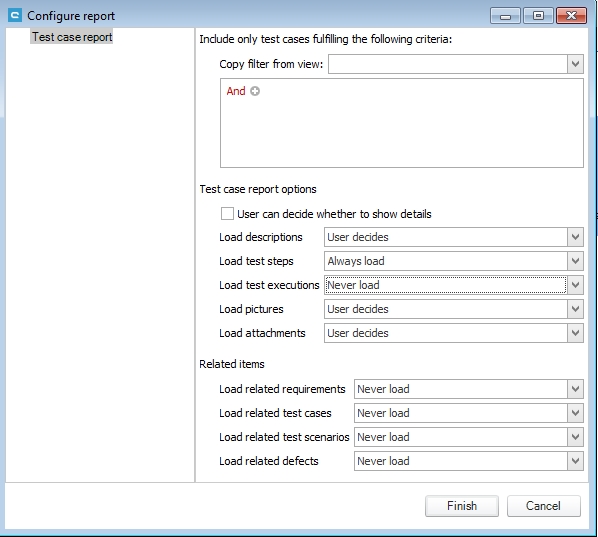 To create a new report, it is important to decide which data you want to use as a basis. You can decide to base your report on requirements, test cases, test scenarios, or defects. The layout designer will not be affected by your choice, only the information displayed after creating the report will be compromised. It makes sense to specify the required data basis as precise as possible in order to avoid loading too much data that is not required in your report.