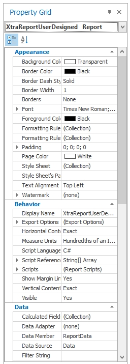 Every element in an aqua report has a set of properties that determine its appearance and the actions taken when the element fires an event. An event fired by an element can be “Before Print”, “After Print”, “Size Changed”, or “Text Changed”, for example. You can define a script function to be executed when such an event is fired. For example, on a “Before Print” event you can change the text of the label, which is useful when a label is printed within an iterating band. Changing the appearance of an element is straightforward. For example, the background colour can be set in the Appearance menu by the Background Colour parameter, or the font size can be changed by the size parameter within the Appearance – Font menu.