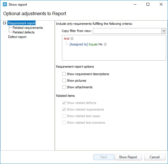 In order to improve performance of report creation, it is important to understand the difference between server-side filtering and report-side filtering. Server-side filtering is done when a user starts to generate a report. The window below shows where a user can set filters ([Assigned to] equals Me). This is done on the server before data is sent to the client (or the report, respectively). It allows you to decrease the amount of data sent to the report.