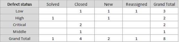 „Row-Area“ field that is configured on Significance shows all the element’s significances as rows. The „Column-Area“ field that is configured on Status shows all statuses as columns, and „Data-Area“ field is configured on the number of elements shows the corresponding number of elements from the significance-status-pairs