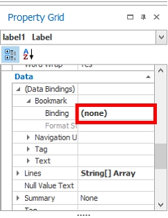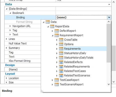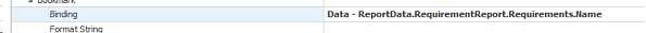 There, define the Binding in Data Binding -> Bookmark. Then, define it using Data->ReportData->RequirementReport->Requirements->Name.