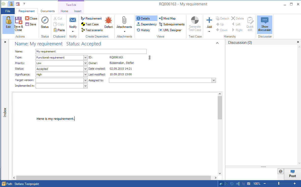 In requirements, you have the option to focus on collaborative work. The Show discussions button allows you to open a new slide where you can work in a real-time chat with other aqua users. To open that module, you have to click on that button.