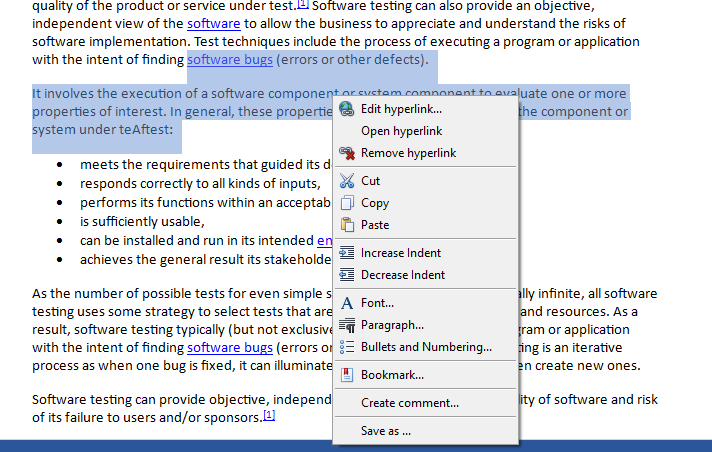 In this example, the introduction on software testing was copied from wikipedia.org. After selecting a section of a text and marking it blue, you can add a comment regarding that section. Right-clicking on a selected item opens a context menu where you can choose Create comment.