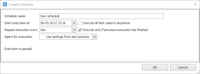 The Scheduled Executions button within the test scenario opens a new window that gives you the option to create and configure multiple execution schedules. To do so, select Add Schedule. A schedule is defined by a start date and an agent that is used. In addition, the repetition rate between days, hours and minutes can be selected. Once the schedule is created, the schedule has to be activated by button Start.