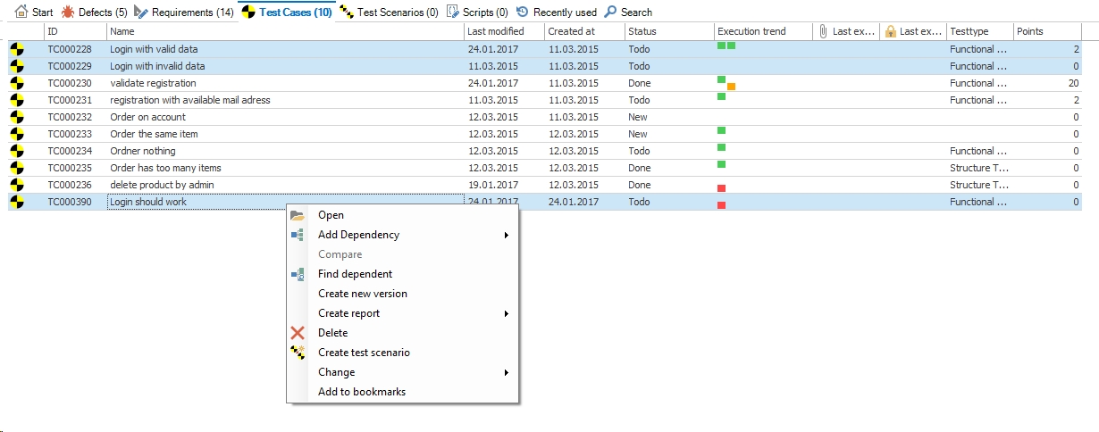 Test scenarios are a defined set of test cases, which can be defined as to execute test cases sequentially or concurrently with different parameters on defined agents. It helps users to organize regression tests and allows them to replay them for scheduled executions. In order to define a set of test cases in a test scenario, select a set of them in the navigation. Then, right-click on them and choose Create test scenario.