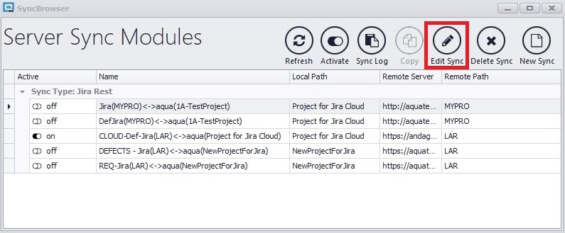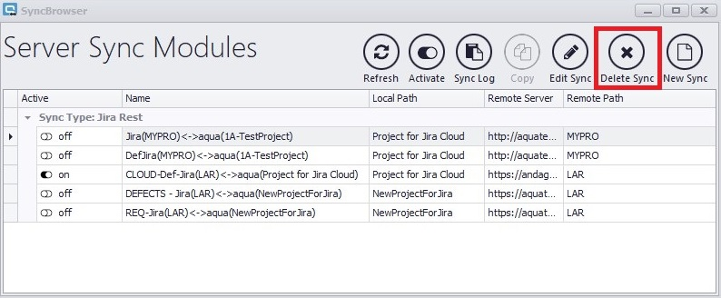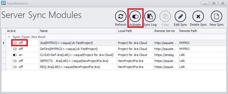 To activate or deactivate existing syncs, you can either click on the switch symbol next to the name of the sync, or select a sync and click on 'Activate'.