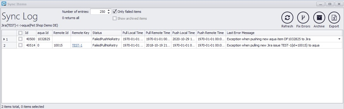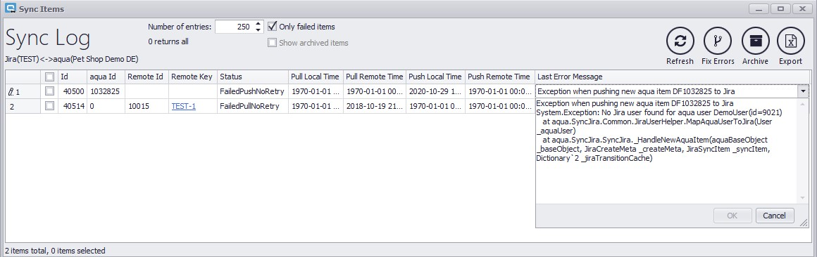 In this example, a user is missing. To fix this error, you can now add the Jira user with the mail and username. Afterwards, you can select this error in the Sync Errors view and click on Fix Errors. Thus, the error will be fixed automatically, and the item will be pushed again. In the Remote Key column, a link to the item in Jira is displayed, which can be used to open the item directly, if it exists in Jira. The Archive button allows you to archive selected error messages. With Show archived items, the archived messages are displayed again and can be fixed with Fix Errors. To apply this, you have to click on Refresh. With Export, you can export all messages from the view as a xlsx file.