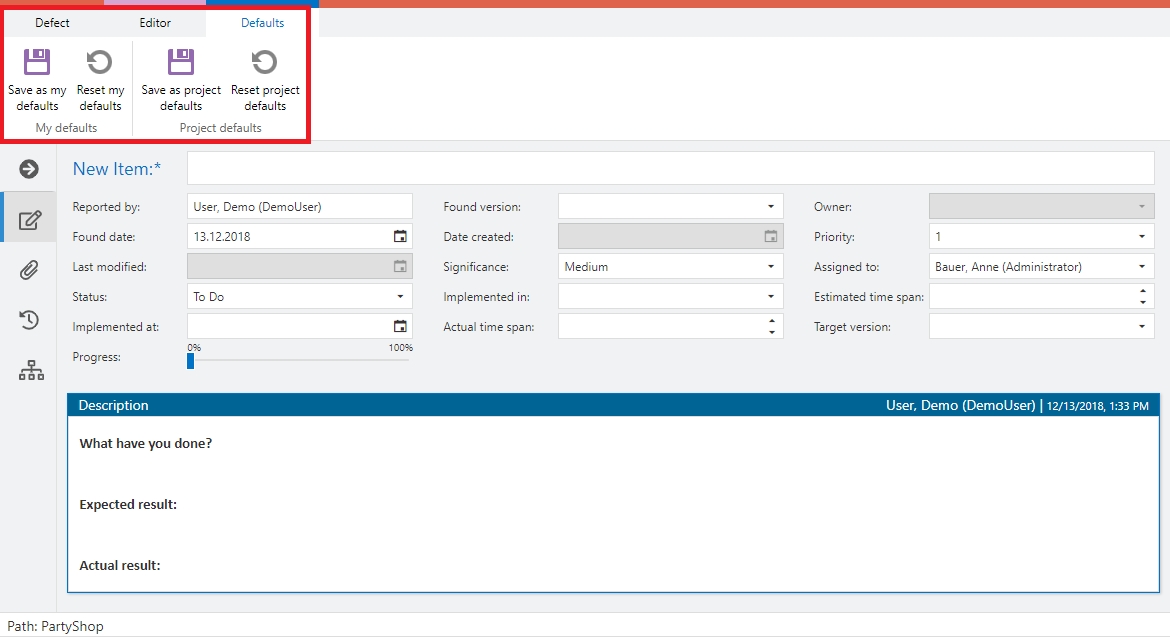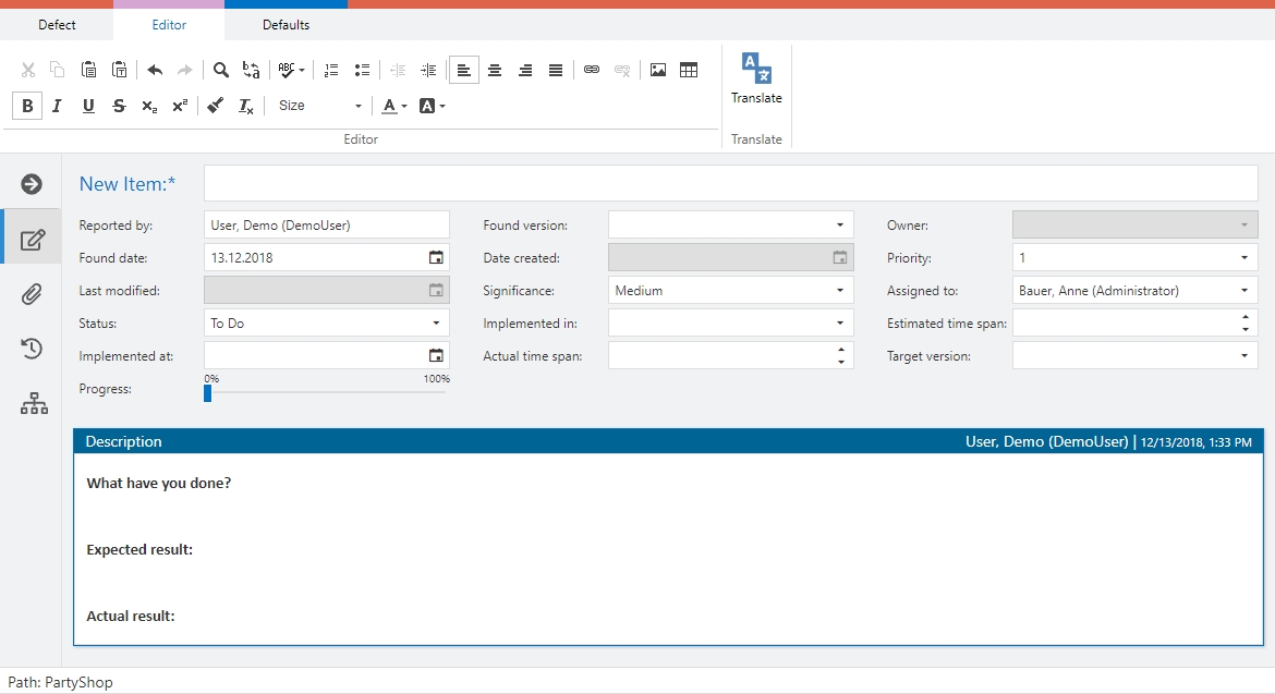 You can define templates for new items, including text and field values. Thus, you can save time when creating new items. To create a template first create a new item. Define your default values, e.g for 'assigned to' and 'significance', and the default text.