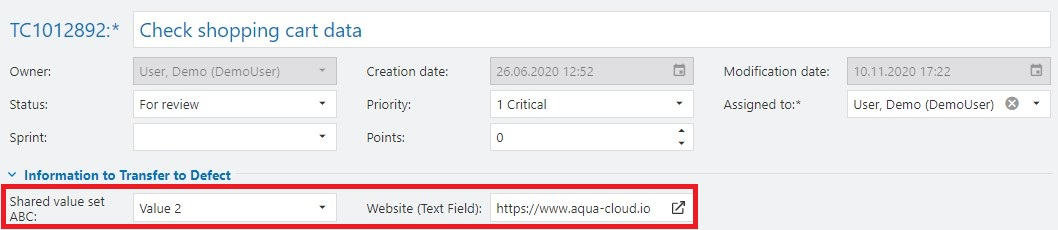Values can be transferred from single selection fields as well as from text fields. To transfer values from selection fields, they must have shared value sets. This means that a shared value set has to be created in the project configuration and used in a selection field in both of the item types, between which you want to transfer the values. This ensures that the same field values are available in both items. In addition, this selection field must have the same name in both items. To transfer text fields, the text field must be named the same in both items, between which you want to transfer the values As an example you can see here a transfer from a selection field (with a shared value set) and a text field from a test case to a defect: