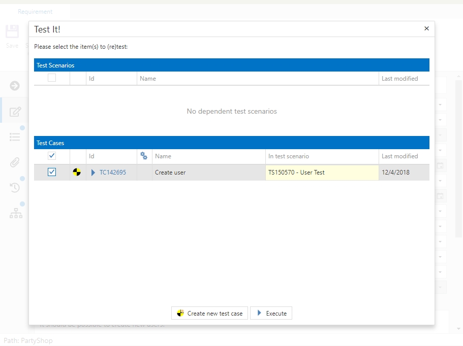 The Test It! feature allows you to instantly test items with related test cases or scenarios. To do so, open an item, e.g. a requirement, with related test cases or test scenarios. Click on the button on the ribbon.