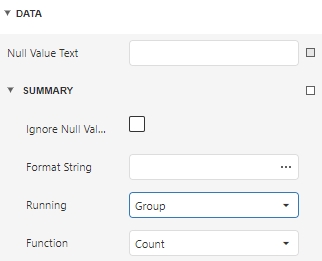 To do this, go to the properties of a field in the Data section and select Summary. In the running field, you can choose to total only the group, the whole report or each page.