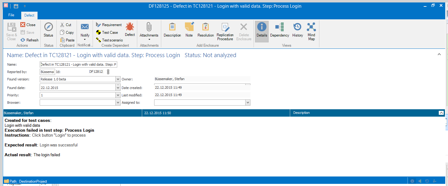 The name is defined by default using the test case ID, test case name, and the test case step. “Found by”, “Found in”, and “Found at” are adopted by the test case. In the description, the defect is defined by default by the main facts of the test step. After saving the defect, you can analyse in dependencies how to reproduce the defect and which test cases have to be executed in order to specify that the functionality is fixed.