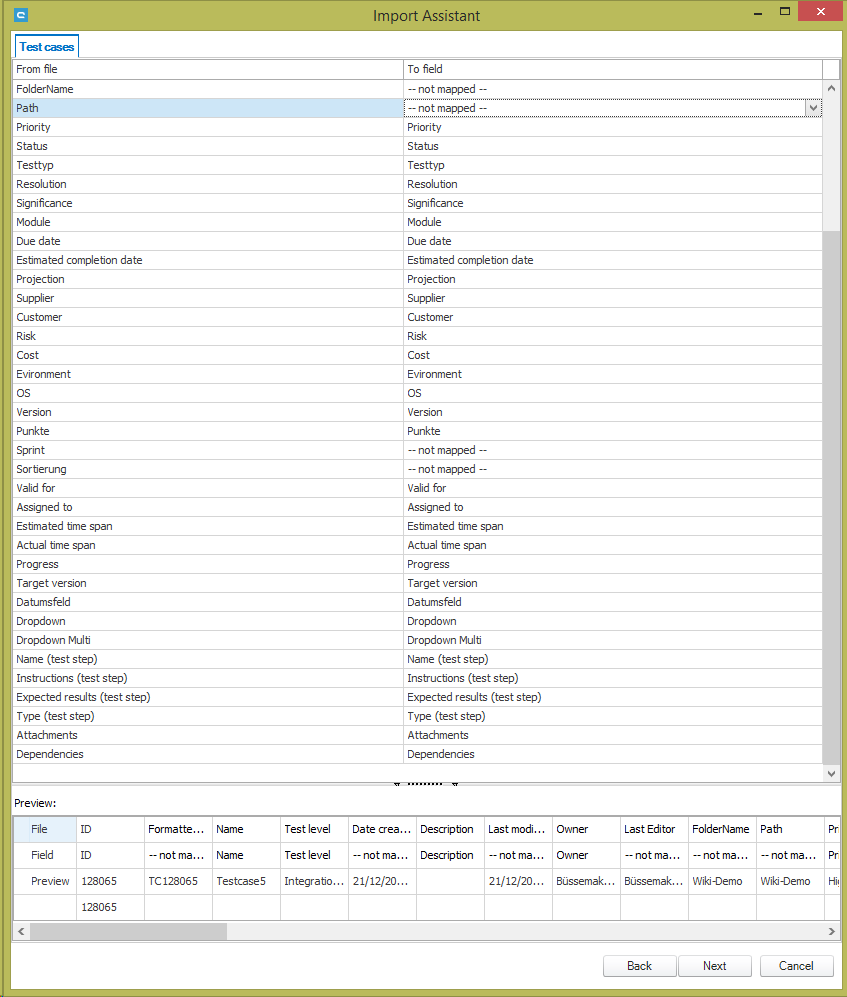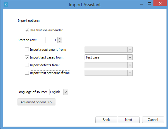 Define which items you want to import. In our example, we will merely import test cases.