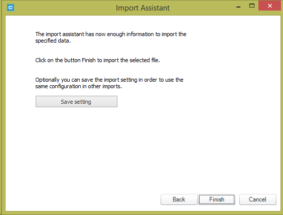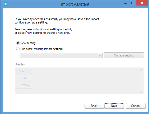 In the next window, you can create a new setting or select an existing import setting which was previously saved during an export. In this example, we are creating a New setting.