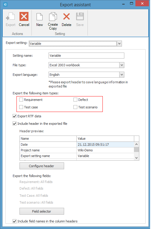 If you activated some item types, you can define which fields should be exported by clicking on Field Selector.