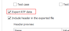 The next step is to select the export language, which defines the language of the exported file. Now you can define which element types should be exported. You must enable them to export them. For example, if you want to export all information stored in Word files, check the Export RTF data box. Otherwise, all fields will be exported as plain text fields. The Export Header contains optional export information and can also be used to automatically detect language information when importing the file.