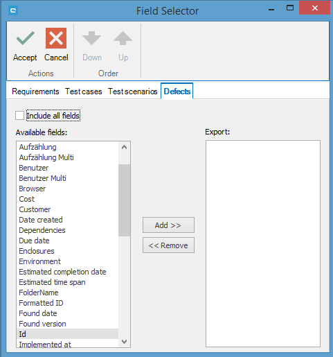 To include all fields in the export, check Include all fields or else specify individual fields in Available fields by clicking on Add.